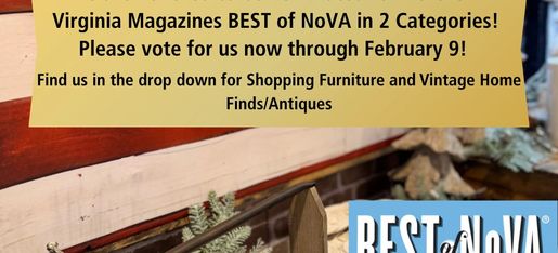 It's award season! We are honored to be nominated in 2 categories for BEST OF NOVA! We would love your support! Find us in the drop down for Furniture and Vintage Home Finds/Antiques. Thank you!